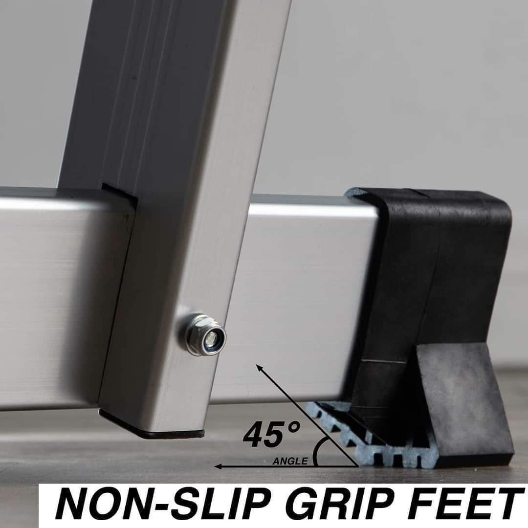 أرجل السلم مزودة بقواعد مطاطية لتوفير حماية الأرضيات ولتعطي السلم تثبيت قوي على الأرض ومنعه من الانزلاق وتوفير أقصى درجات السلامة